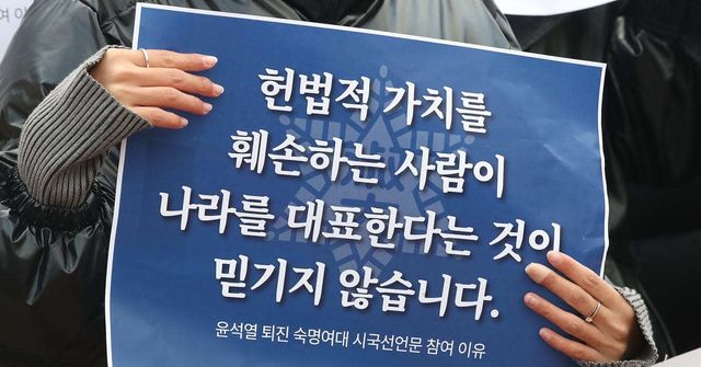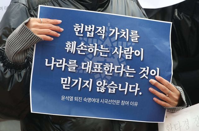 숙명여자대학교 학생이 5일 오후 서울 용산구 숙명여자대학교에서 열린 '윤석열 대통령 퇴진을 위한 숙명여대 2,626인 대학생 시국선언' 기자회견에서 손피켓을 들고 있다. / 뉴스1