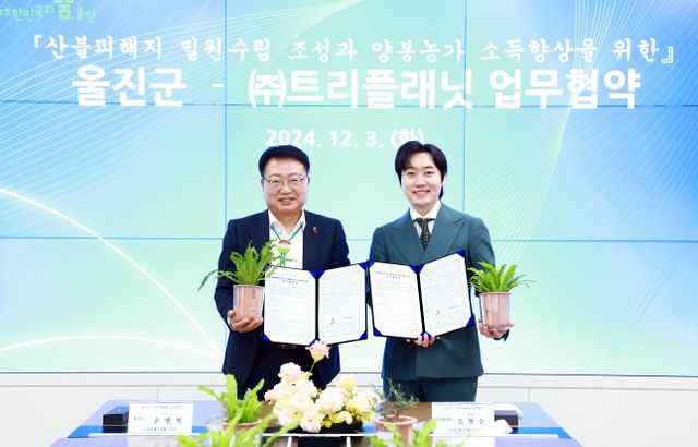 | ▲ 울진군-(주)트리플래닛, 산불피해지 밀원수조성 및 양봉농가 소득향상을 위한 업무협약 체결 |