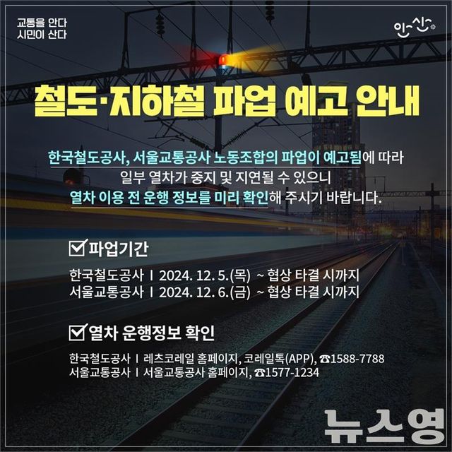 이민근 안산시장은 “이번 철도노조 총파업으로 시민들이 불편을 겪을 수 있어 우려된다”라며 “이번 파업 기간 동안 전세버스 투입 등 비상수송 대책을 철저히 추진해 시민 불편을 최소화할 수 있도록 노력하겠다”고 말했다.
