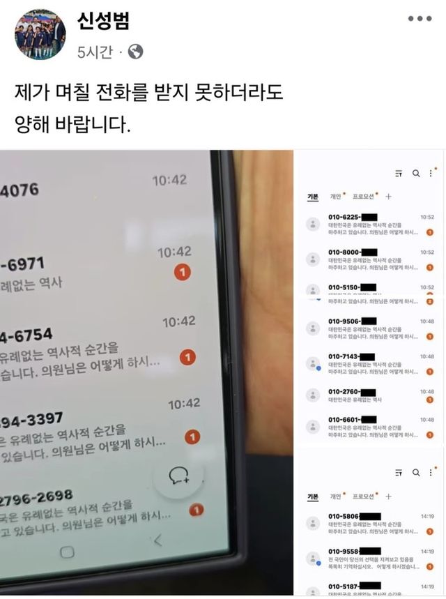 한편 신성범 국민의힘 의원은 이날 SNS에 "제가 며칠 전화를 받지 못하더라도 양해 바란다"면서 같은 내용의 문자가 4039개 수신된 휴대전화 캡처 화면을 함께 올렸다.
