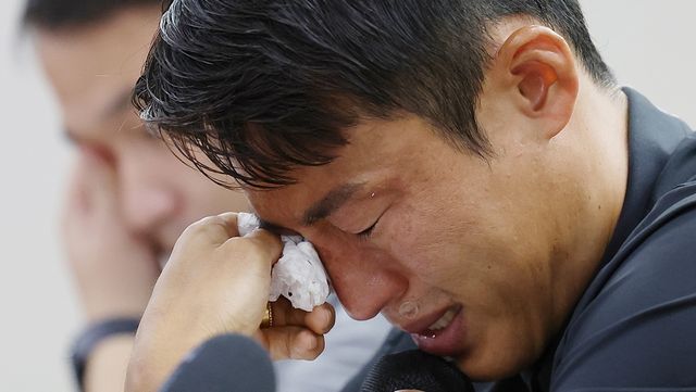 축구 국가대표 출신 손준호(수원FC)가 11일 오후 경기도 수원시 장안구 수원시체육회관에서 열린 중국축구협회 영구 제명 징계 관련 기자회견에서 눈물을 닦고 있다. / 연합뉴스