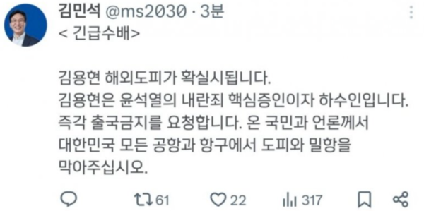 김민석 민주당 의원은 “김용현 전 장관은 윤 대통령의 내란 혐의 핵심 증인이자 실행자”라며 출국 금지를 요청했다.