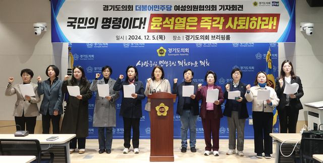 [와이뉴스] 경기도의회 더불어민주당 여성의원협의회(신미숙 회장(화성4) 이하 민여협)가 5일 기자회견을 열고 윤석열 대통령의 비상계엄 선포를 규탄하고 퇴진을 촉구하는 결의문을 발표했다.