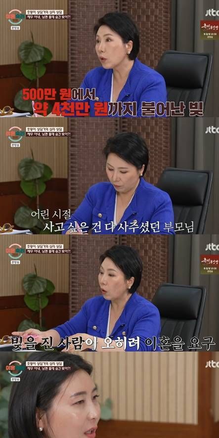 심리 상담가는 "500만 원에서 4000만 원이 되고"라고 했고, 아내는 "500만 원은 빌린 건 아니고 론"이라고 했다. 그러자 심리 상담가는 "론이 빌리는 거다. 돈에 대한 개념이 없다"고 지적했다.