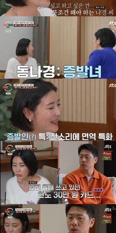 심리상담가는 "고마울 건 아니고"라며 "제 상담 역사에서 특이한 분이다. 100점이 나온다는 건 물불 안 가린다. 집중력 자체가 굉장히 낮다. 제가 기억하고 싶은 것만 기억하지. 인생에 이름을 붙인다면 '동나경: 증발녀'다. 돈도 증말, 생각도 증발해버리고"라며 잔소리를 해도 타격이 없는 스타일이라고 덧붙였다.
