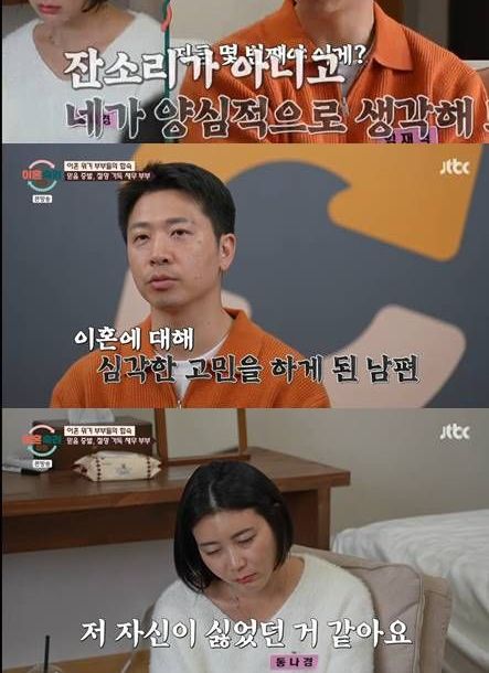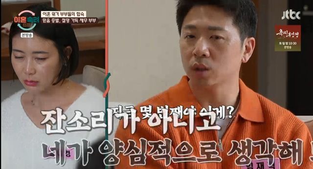 아내는 "뭔가 부족하다고 생각했다"라고 대답했다. 남편은 "이해가 안 간다. 언제까지 이렇게 계속 해야하는거냐"며 "이게 몇 번째냐. 잔소리가 아니고 양심적으로 생각해 봐라. 이해가 안 간다. 뭘 어떻게 믿어야 할지 모르겠다"라고 했다.