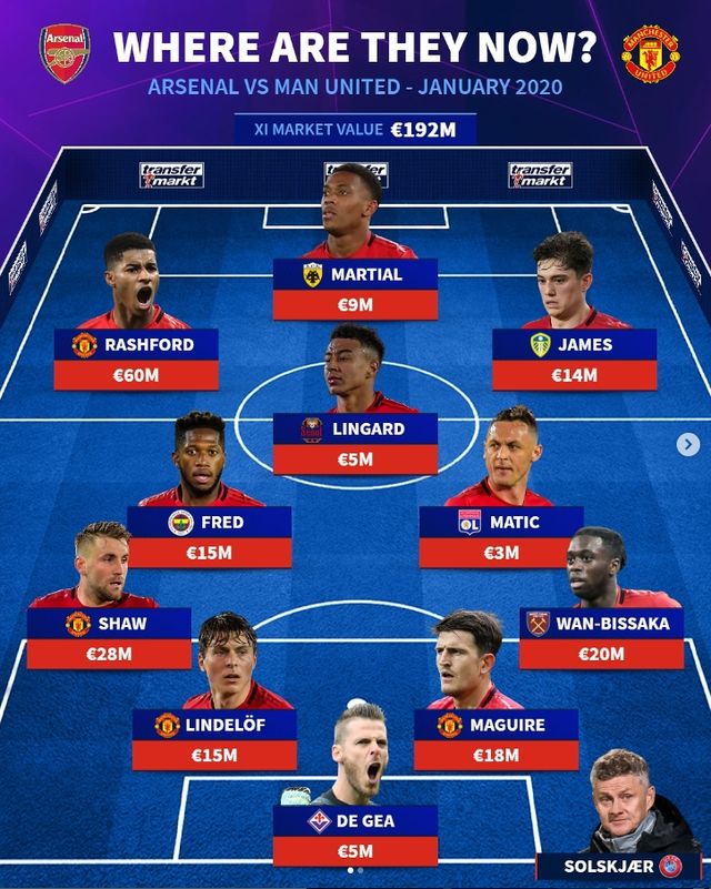 '트랜스퍼마크트'는 5일(한국시간) 영국 런던에 위치한 아스널의 홈구장 에미레이트 스타디움에서 열린 맨유와 아스널의 2024-25시즌 프리미어리그(PL) 14라운드 경기에 앞서 공식 사회관계망서비스(SNS)를 통해 2020년 1월에 맞대결을 펼쳤을 당시 출전했던 두 팀의 선수들이 현재 어디서 뛰고 있는지 살펴봤다.