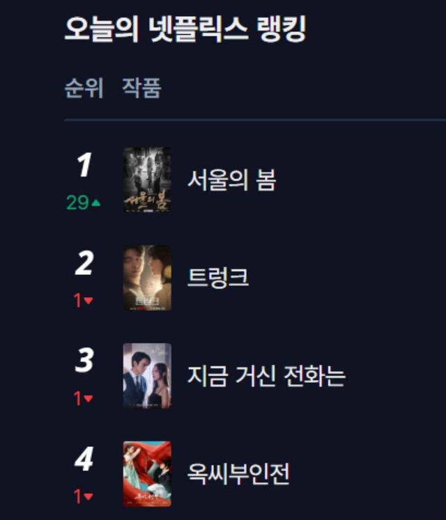 영화 '서울의 봄'이 최근 비상계엄 선포와 관련해 재조명되고 있다. 6일 오전 1시 기준, OTT 통합검색 및 콘텐츠 추천을 제공하는 키노라이츠에서 '오늘의 넷플릭스 랭킹' 1위를 기록했다. 2위는 '트렁크', 3위는 '지금 거신 전화는', 4위는 '옥씨부인전', 5위는 '조립식 가족', 6위는 '가석방 심사관 이한신'이 차지했다.