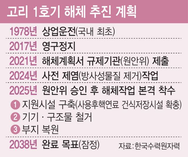 40년간 가동을 마치고 수명이 다한 고리1기호는 지난 2017년부터 정지 상태다. 한수원은 2021년 5월 원안위에 고리1호에 대한 해체 승인을 신청하고 지난 5월부터 방사성 물질을 화학약품으로 제거하는 제염 작업을 진행하고 있다. 예정대로라면 내년 상반기 원안위 승인 후 원전 해체 지원 시설 구축과 구조물 철거, 부지 복원에 이르는 해체 공정이 시작돼야 한다.
