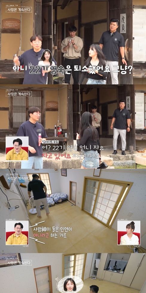 이에 16기 영자가 "언니 피곤하다고 자고 있다"라고 알렸다. 기다림에 지친 미스터 배의 모습을 본 MC 데프콘은 "사랑신이 둘이 인연이 아니라고 하는 거다"라며 안타까움을 표했다.