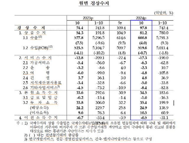6일 한국은행이 발표한 ‘10월 국제수지(잠정)’에 따르면 10월 경상수지는 97억 8000만달러 흑자를 기록했다. 경상수지는 지난 5월(89억 2000만달러) 흑자 전환한 이후 여섯 달째 흑자 흐름을 보이고 있다.