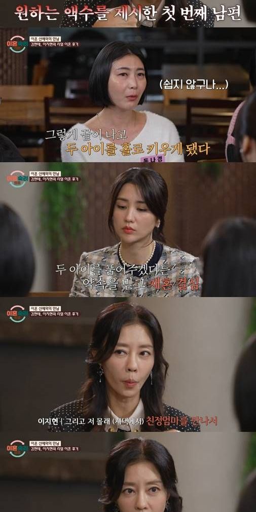 이지현은 "첫 번째 결혼은 3개월 연애하고 결혼을 했는데 너무 제가 몰랐던 것들이 하나하나씩 양파 껍질처럼 까지는데 감당할 수 없더라 가슴 아픈 일들이 많았는데 아이들이 알기를 원치 않았기 때문에 소송을 걸지 않고 조정을 5번 걸쳐서 이혼하게 됐다. 조정을 다섯 번째까지 갔을 때 얘기하더라. 액수를 제시하더라. 다 가져가도 좋으니까 우리 이혼만 하자고 해서 끝이 났다"고 말했다.