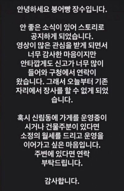 말 그대로 ‘잘 생겨서’ 화제가 된 붕어빵 노점상은 최근 SNS에 “영상이 많은 관심을 받게 되면서 너무 감사한 마음이지만 안타깝게도 신고가 너무 많이 들어와 구청에서 연락이 왔다”며 “그래서 오늘부터 기존 자리에서 장사를 할 수 없게 됐다”고 알렸다.