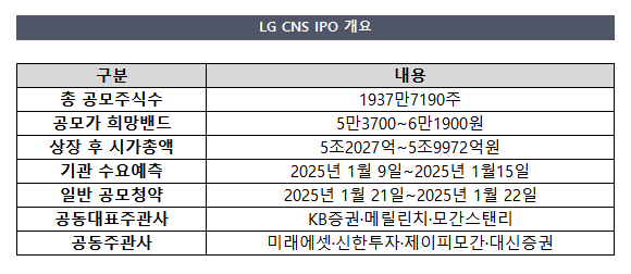 LG CNS는 내년 1월 9일부터 15일까지 기관투자자를 대상으로 수요예측을 진행한다. 같은달 21일부터 22일까지 일반 공모청약을 실시해 2월 유가증권시장에 상장하는 것이 이 회사의 목표다. 공동 대표 주관사는 KB·메릴린치인터내셔날엘엘씨·모간스탠리인터내셔날증권이다. 공동주관사는 미래에셋·신한투자·제이피모간·대신증권이다.