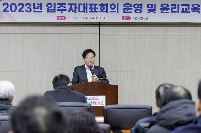 | ▲ 박강수 마포구청장이 입주자대표회의 운영 및 윤리교육에 참석해 주민들과 소통하고 있다. |