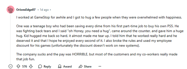 그 중 한 명은 첫 아르바이트를 하며 한 푼 두 푼 모아 자신의 PS5를 사려고 했던 10대 소년이었습니다. 그 아이가 눈물을 흘리는데 제가 “얘야, 안아줘야겠다”라고 말하며 카운터로 다가와서 아이를 크게 안아줬어요. 아이는 저를 너무 세게 안아줘서 눈물이 날 뻔했어요. 저는 아이에게 정말 열심히 일했고 그럴 자격이 충분하며 매 순간을 즐겼으면 좋겠다고 말했어요. 저는 또한 규칙을 어기고 직원 할인을 그의 게임에 사용했습니다(안타깝게도 새 시스템에서는 할인이 적용되지 않습니다).