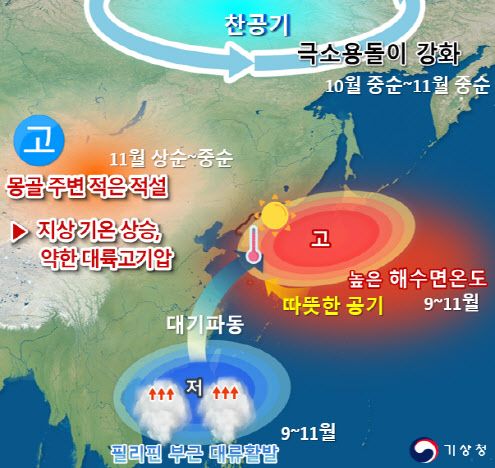 필리핀 부근의 대류활동은 가을철 태풍에도 영향을 미쳤다. 올가을 북서태평양에서 발생한 태풍은 15개로 평년(10.7개)보다 4.3개 더 발생했다. 9월과 11월 두 차례 태풍이 동중국해상을 지나 북상했고, 한반도 주변에서 약해졌지만 태풍의 수증기가 국내로 유입돼 많은 양의 비가 내렸다. 또 수증기를 포함한 남풍도 불어서 9~11월 강수량은 평년(266.1㎜)보다 1.5배(149.6㎜) 많은 415.7㎜를 기록했다. 10월 강수일수(11일)도 평년보다 5.1일 긴 역대 1위를 기록했다.