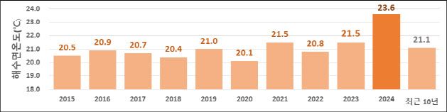 가을철 기온이 높게 유지된 원인 중 하나는 따뜻한 바다인 것으로 조사됐다. 9~11월 필리핀 부근의 대류활동이 증가하고, 이곳에서 우리나라 부근으로 이동한 공기에 의해 고기압이 발달하면서 한동안 강한 햇볕이 내리쬐는 맑은 날씨가 계속됐다. 이렇게 따뜻해진 한반도 주변 해상과 북서태평양에서 고온다습한 공기가 남풍에 의해 한반도로 유입되면서 국내 기온이 높게 유지됐다. 2024년 우리나라 해역의 가을철 평균 해수면 온도는 23.6도로 나타났다. 최근 10년(2015~2024년) 평균(21.1도)보다 2.5도 높았고, 최근 10년 중에서도 가장 높았다. 해역별로는 서해의 평균 해수면 온도(22.4도)가 다른 해역에 비해 편차가 가장 컸다.