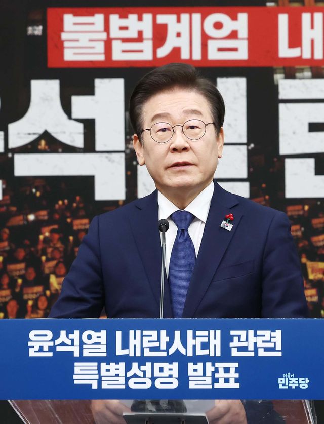 이재명 더불어민주당 대표가 6일 서울 여의도 국회에서 윤석열 내란사태 관련 특별성명을 발표하고 있다. / 뉴스1