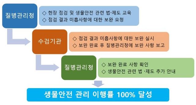 질병관리청은 현장에서 확인된 생물안전 관리 미흡 사항에 대해 즉시 보완을 요청하여 보완 사항 완료 여부를 점검했고, 필요한 생물안전‧보안 교육을 제공하여 모든 시설이 안전관리 기준을 충족(안전관리 이행률 100%)함을 확인했다.