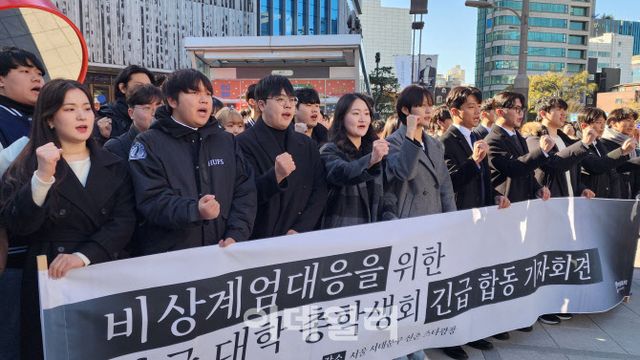 각 대학 총학회장은 번갈아 가며 규탄 발언을 이어갔다. 먼저 발언에 나선 백범준 고려대 중앙집행위원장은 “선배들이 피로 지켜내고 후배들이 누려야 할 자유를 찬탈하려는 시도에 침묵하면 부끄러운 일이 아닐 수 없다”며 “학생사회는 불의의 항거하려는 목소리에 함께해야 한다”고 말했다.