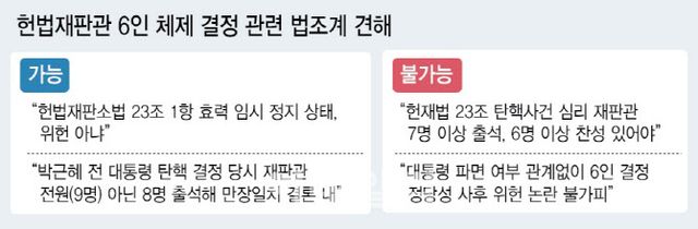 따라서 현재 재판관 6인이 모두 동의할 경우 대통령 탄핵 결정도 이론적으로는 가능하다. 박 전 대통령 탄핵 결정도 당시 헌재소장이 없는 상태에서 권한대행 체제로 8명의 재판관이 결론을 냈다.