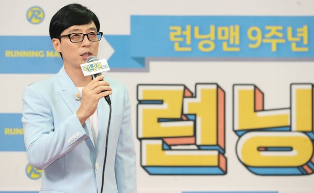개그맨 유재석이 2019년 8월 26일 오후 서울 서대문구 이화여대 대강당에서 열린 SBS 런닝맨 9주년 기념 팬미팅 '런닝구' 포토월 행사에서 인사말을 하고 있다. / 연합뉴스
