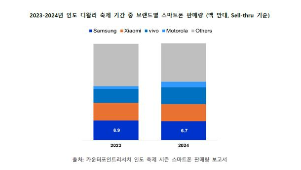 6일 시장조사기관 카운터포인트리서치에 따르면 올 9월 24일부터 10월 24일까지 진행된 인도 디왈리 축제 기간 판매된 스마트폰 브랜드를 조사한 결과, 삼성전자가 작년에 이어 점유율 1위를 차지했다.