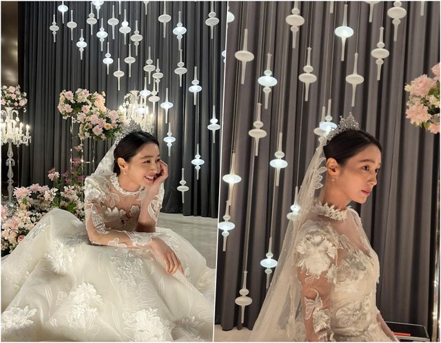 이민정이 웨딩 드레스 자태를 뽐냈다.