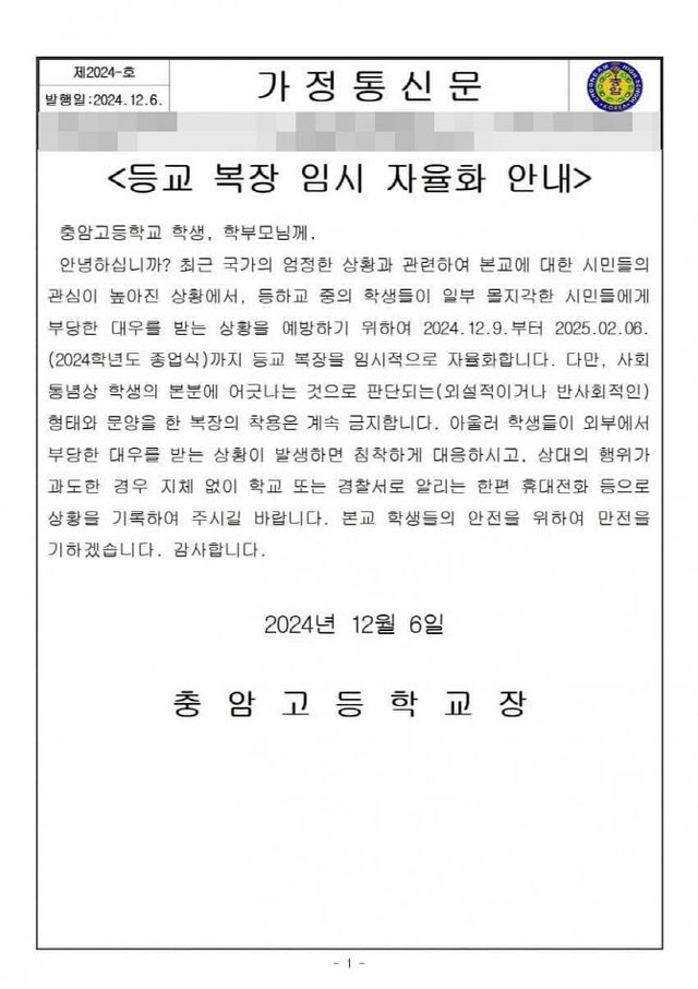 학교는 가정통신문을 통해 오는 9일부터 2025년 2월 6일 졸업식까지 등교 복장을 자율화한다고 밝혔다. 학교는 가정통신문을 통해 “일부 물의를 일으킨 시민들에게 부당한 대우를 받는 상황을 예방하기 위한 조치”라고 설명했다.