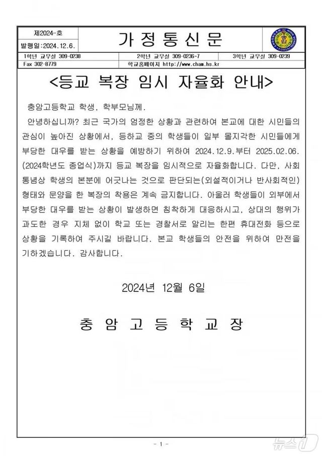충암고등학교는 최근 정치적 정세와 학생들의 안전을 고려하여 교복 대신 자율 복장을 허가하기로 결정했습니다. 윤석열 대통령의 모교로 알려진 충암고는 정치적 상황으로 인해 학생들이 부당한 대우를 받을 우려가 커지고 있어, 이러한 조치를 취한 것으로 보입니다.