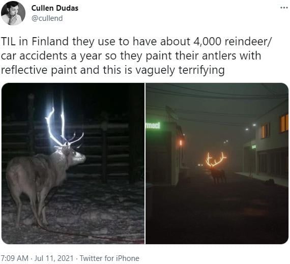 순록으로 인한 교통사고가 매년 4천건씩 발생해서 뿔에다 형광물질을 바름 그 결과...
