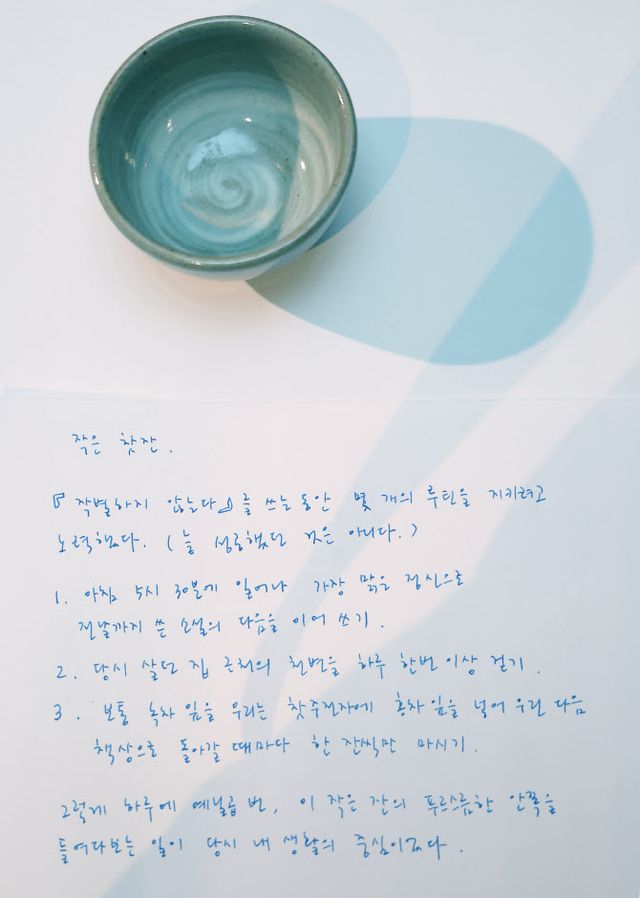 그는 메모에 “‘작별하지 않는다’를 쓰는 동안 몇 개의 루틴을 지키려고 노력했다. (늘 성공했던 것은 아니다)”라고 소개한 뒤 찻잔에 담긴 사연을 설명했다.
