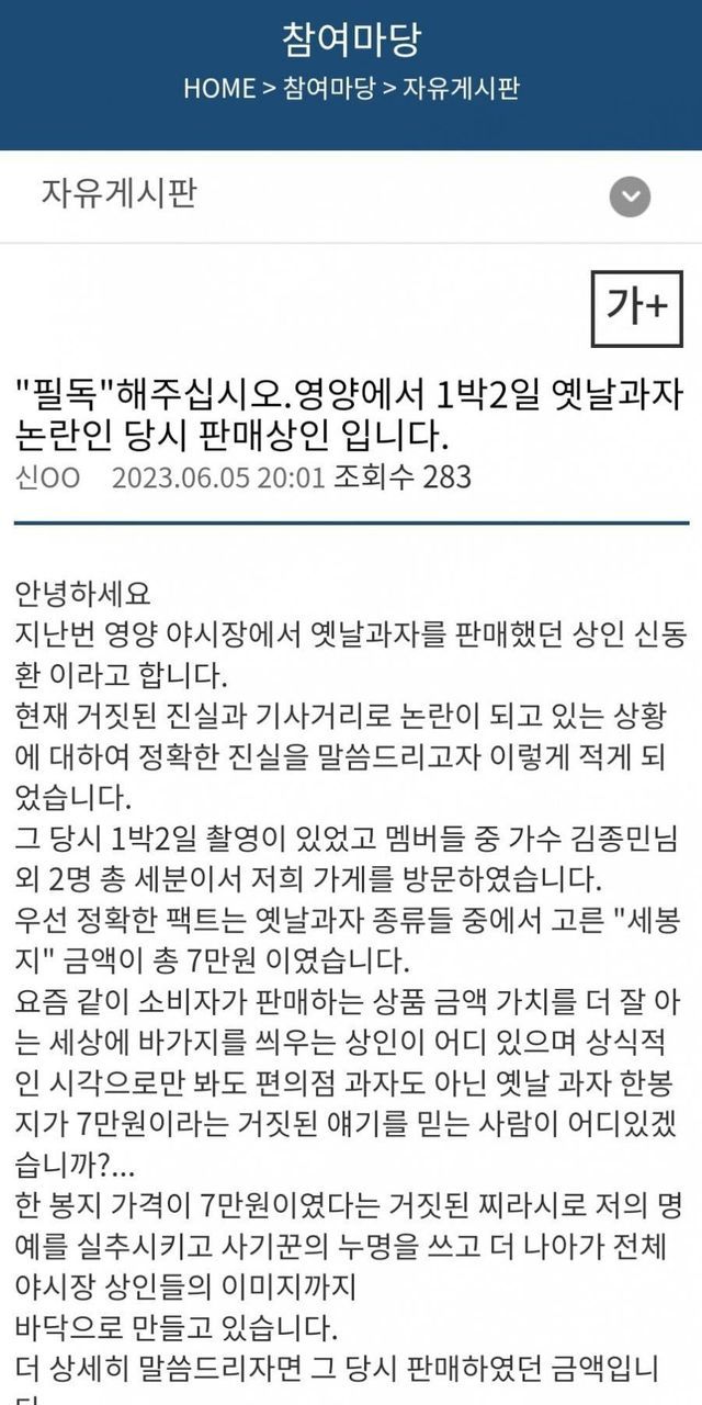 옆가게 상인이 쓴 글