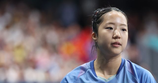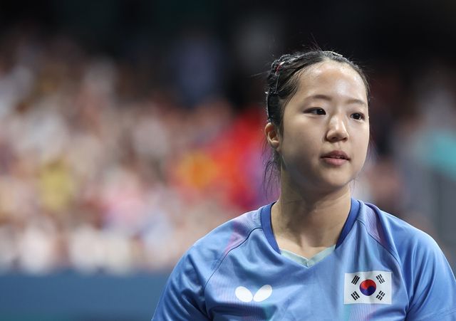 지난 8월 2일(현지 시각) 프랑스 파리 사우스 파리 아레나에서 열린 2024 파리올림픽 탁구 여자 단식 4강전에서 한국 신유빈이 중국 천멍을 상대로 패배한 뒤 아쉬워하고 있다. / 연합뉴스