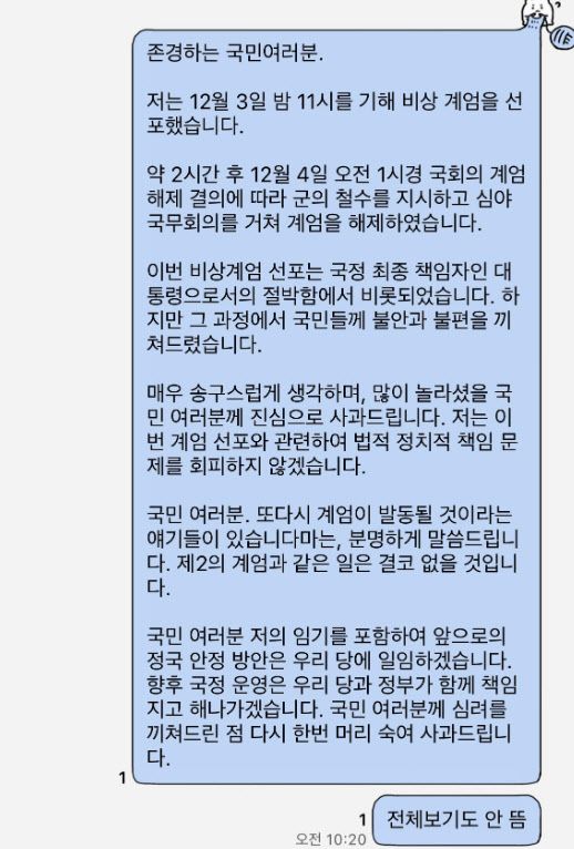 네티즌들은 “담화가 얼마나 짧으면 카톡에서 한 번에 볼 수 있다”, “시작과 동시에 끝나기에 담화 시간이 앞당겨진 줄 알았다”, “유튜브 광고 보고 나니 들어가니 담화가 끝났다”, “친구한테 사과할 때도 이렇게 하면 손절당한다” 등의 반응을 보이고 있다.