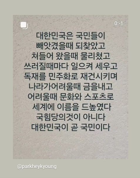 7일 박혜경은 "대한민국은 국민들이 빼앗겼을 때 되찾았고 쳐들어 왔을 때 물리쳤고 쓰러질 때마다 일으켜 세우고 독재를 민주화로 재건시키며 나라가 어려울 때 금을 내고 어려울 때 문화와 스포츠로 세계에 이름을 드높였다. 국힘당의 것이 아니다. 대한민국이 곧 국민이다"라는 글을 적었다.