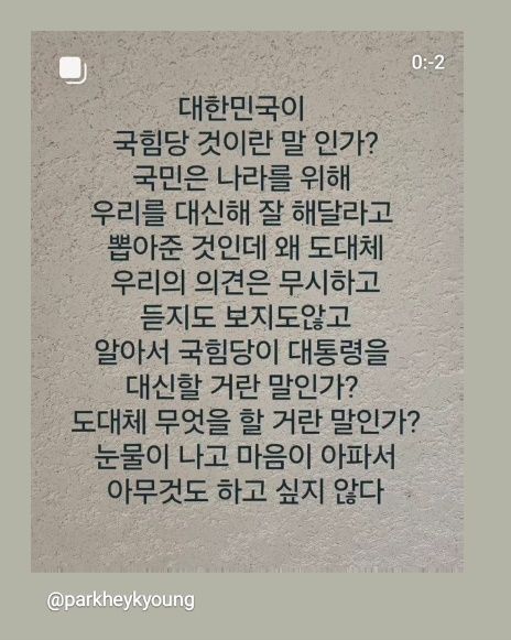이어 "대한민국이 국힘당 것이란 말인가? 국민은 나라를 위해 우리를 대신해 잘해달라고 뽑아준 것인데 왜 도대체 우리의 의견은 무시하고 듣지도 보지도 않고 알아서 국힘당이 대통령을 대신할 거란 말인가? 도대체 무엇을 할 거란 말인가? 눈물이 나고 마음이 아파서 아무것도 하고 싶지 않다"라고 덧붙였다.