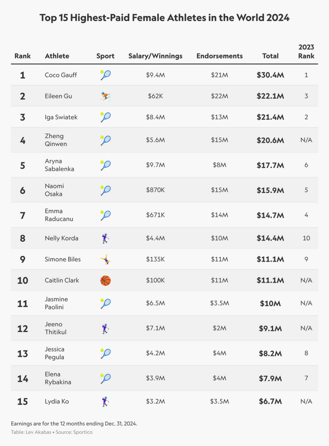 미국의 한 스포츠 비즈니스 매체가 2024년 여자 선수 수입 톱15을 공개했다. 상위 15명 중 9명이 테니스 선수인 것이 눈에 띄었다. 한국계 선수 제시카 페굴라와 리디아 고도 이름을 올렸다.