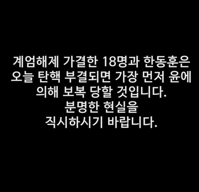 그는 "계엄 해제에 찬성한 18명과 한동훈 대표는 오늘 탄핵이 부결되면 가장 먼저 윤 (대통령)에 의해 보복당할 것"이라는 주장의 예언성 글을 남겼다. 그러면서 "분명한 현실을 직시하길 바란다"고 강조했다. 김 의원의 이 발언은 탄핵 표결을 앞두고 한층 격화된 여야 간 공방의 단면을 보여준다.