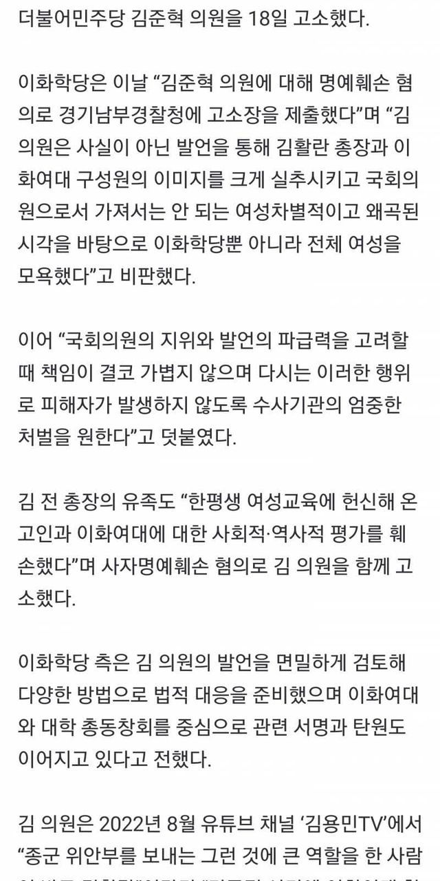 이화여대, ‘이대생 성상납 발언’ 김준혁 의원 고소