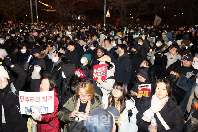 박찬대 더불어민주당 원내대표가 국민의힘 의원들의 이름을 하나하나 부르는 장면이 스크린에서 나오자 시민들 역시 의원들의 이름을 부르며 “돌아와”라고 외쳤다. 김예지 국민의힘 의원과 김상욱 국민의힘 의원이 본회의장으로 다시 돌아와 투표에 참여하자 시민들은 이들의 이름을 부르며 환호를 보내기도 했다.