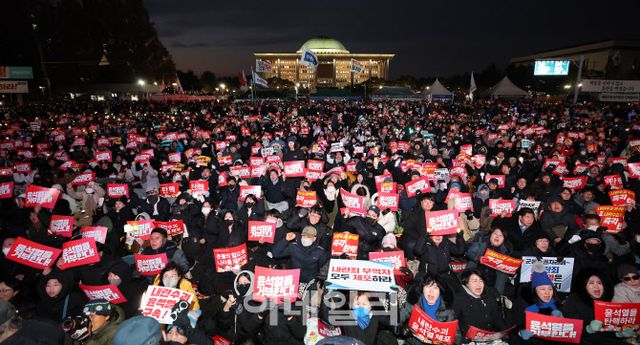 뒤이어 국민의힘 의원들이 탄핵소추안 표결에 참여하지 않기로 했다는 소식이 전해지자 곳곳에서 욕설이 쏟아졌다. 한 시민은 들고 있던 팻말을 바닥에 놓은 채 담배를 꺼내 들었다. 어디선가 ‘탄핵’이라는 구호가 나오자 시민들은 너나 할 것 없이 한 목소리로 ‘탄핵’을 따라 외치기도 했다. 일부 시민들은 눈물을 훔치기도 했다.