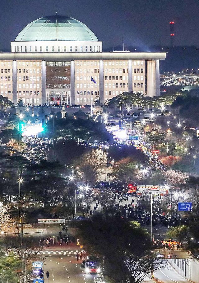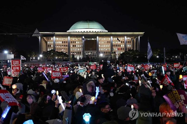 7일 서울 여의도 국회 앞에서 열린 범국민촛불대행진에 참가한 시민들이 늦은 시간까지 모여 윤석열 대통령의 탄핵소추안 가결을 촉구하고 있다. / 뉴스1