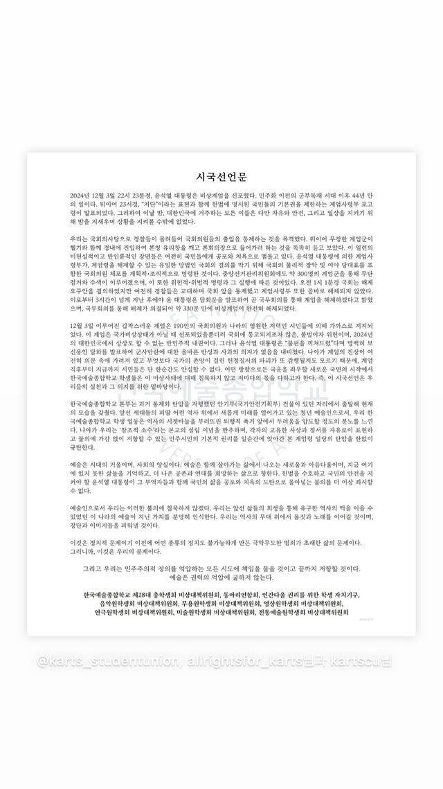 배우 이엘은 자신의 모교인 성균관대학교 총학생회의 비상계엄 선포 규탄 성명을 공유했고, 변영주 감독은 이화여자대학교 정치외교학과 22학번의 호소문을 공유했고, 배우 고현정이 이에 불꽃 이모티콘을 남기며 동의를 표했다.