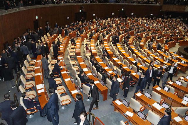 국민의힘은 무기명 투표 방식에서 당론을 이탈하는 표를 막기 위해 집단 퇴장 전략을 택한 것으로 분석된다.