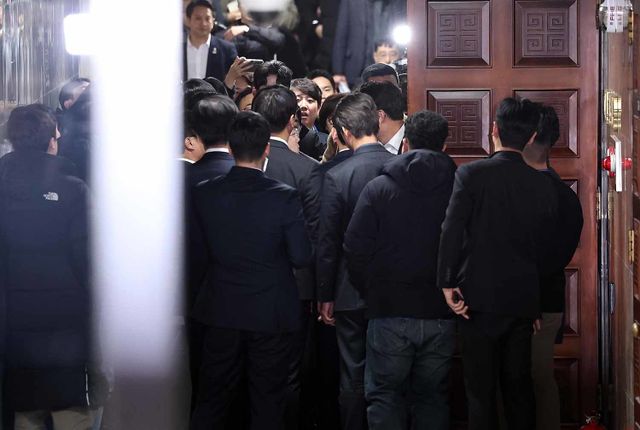 박성준 더불어민주당 원내수석부대표와 이준석 개혁신당 의원 등 야당 의원들이 윤석열 대통령의 탄핵 표결이 진행중인 7일 오후 서울 여의도 국회에서 표결에 불참한 국민의힘에 항의하기 위해 여당 의총장을 방문을 하고 있다. / 뉴스1