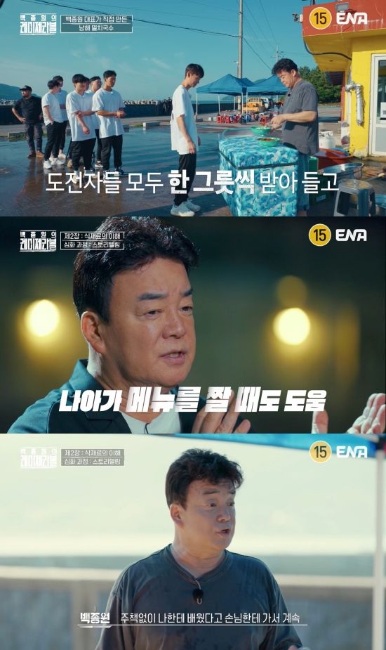 작업을 마친 이들에게 백종원은 멸치국수를 대접했다. 그는 "바닷바람 맞아가면서 고생할 걸 생각하니 따뜻한 국물 있는 요리를 해주고 싶어서"라고 요리를 준비한 이유를 밝혔다.