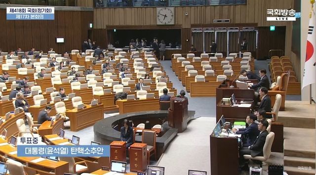 7일 오후 5시 제418회 국회 정기회 제17차 본회의가 개회됐다. 상정된 안건은 윤석열 대통령 배우자 김건희 여사 주가조작 사건 등의 진상규명을 위한 특별검사 임명 등에 관한 법률안 재의의 건, 대통령 윤석열 탄핵소추안이었다. 여기에서 국민의힘 의원들은 앞서 진행된 김건희 여사 특검법 투표만 마친 뒤 대부분 본회의장을 빠져 나갔다.