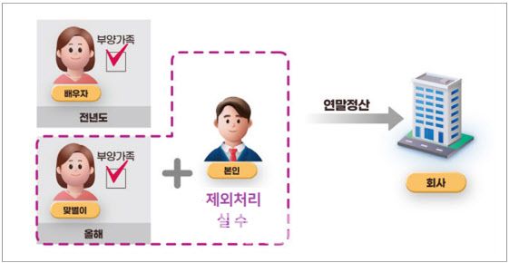 회사 연말정산 시스템에서 배우자가 부양가족 공제 대상으로 기본값 설정돼 있는 것을 올해 실수로 제외하지 못하고 부양가족 공제를 받으면서 배우지가 지출한 보험료·기부금·신용카드 사용금액도 모두 공제 받았다.